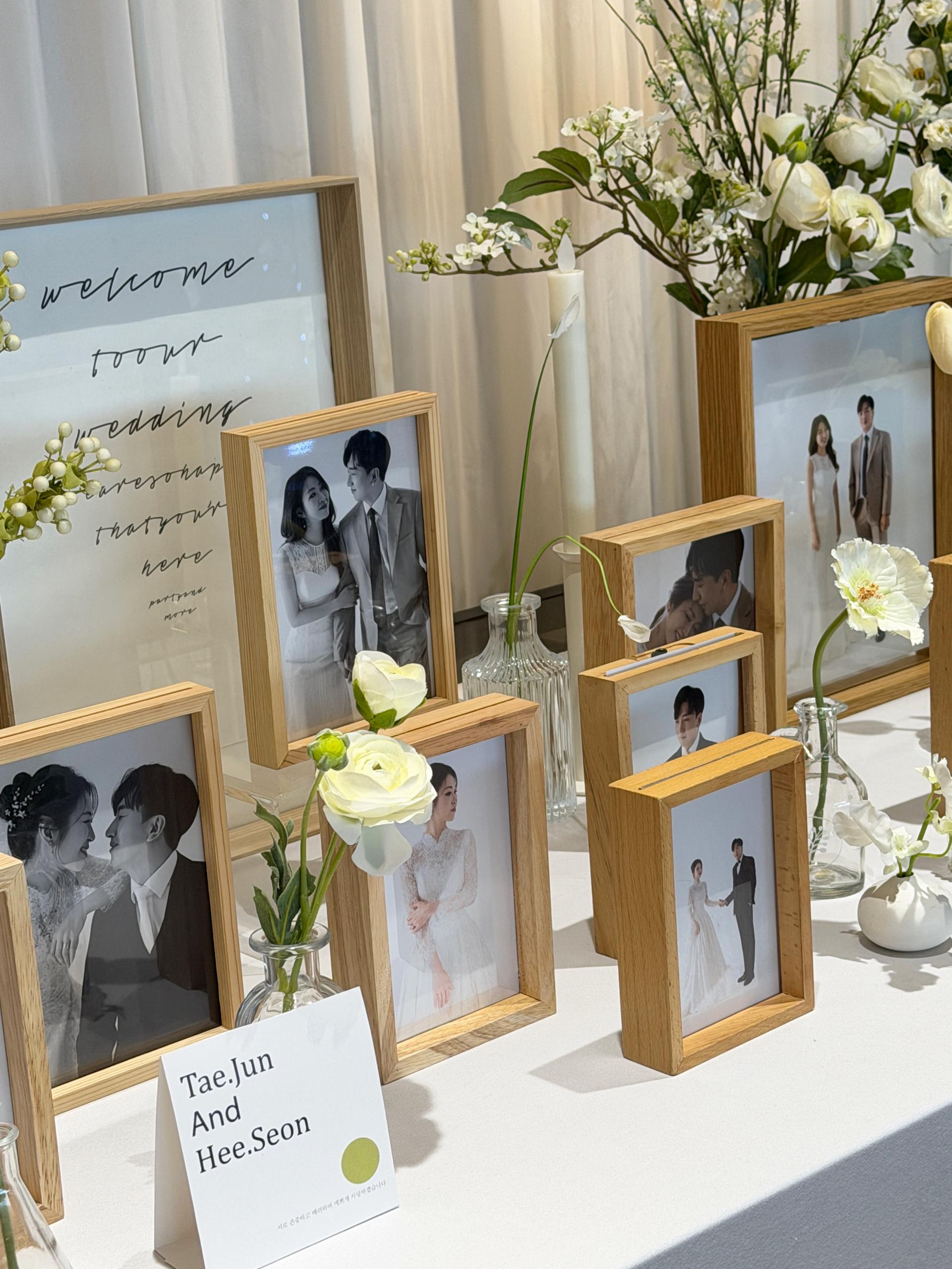 싱그러운 실크프라워의 내추럴함과 나무액자의 목가적인 자연스러움이 돋보이는 포토테이블입니다.
